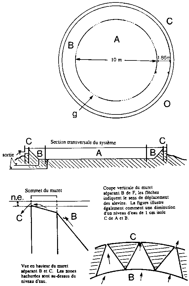 Le triage sélectif peut être réalisé dans des raceways rectangulaires, le système de triage étant constitué d'un grillage en forme de sac dont l'entrée est de dimension égale à la largeur du raceway et qui peut ainsi être déplacé tout au long du tank en ne retenant que les individus de grande taille. D'autres systèmes ont également été décrits par BALARIN et HALLER (1982) et ARMITAGE et al (1987). L'espacement des grilles est imposé par l'épaisseur du poisson (Tableau 2.37).