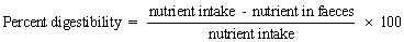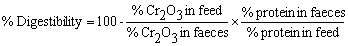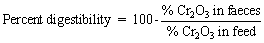 Chromium oxide (Cr2O3) mixed with prepared diets and measured in the faeces provides a general comparison of the overall digestibility of a feed expressed as: