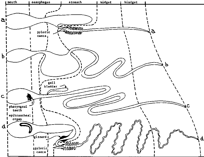 Fig. 1. Diagrammatic representation of the digestive systems of four fish described in the text, arranged in order of increasing gut length.