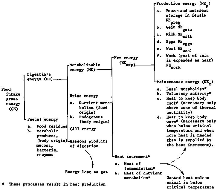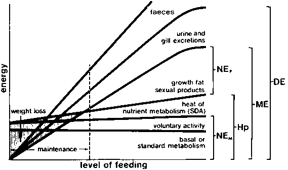 The biological partition of energy in fish is shown in; Figure 1. It should be kept in mind that energy needs for maintenance and voluntary activity must be satisfied before energy is available for growth. Also during times of low food intake fat and protein are withdrawn from the animal body to provide the energy needs for maintenance and the animal loses weight.