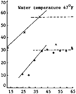 Gross protein requirements have been determined for a few species of fish (see Table 1). Simulated whole egg protein component of test diets contains an excess of indispensable amino acids. These diets were kept approximately isocaloric by adjusting total protein plus digestible carbohydrate components to a fixed amount as the protein diet treatments were varied over the ranges tested. Tests in feeding fry, fingerling, and yearling fish have shown that gross protein requirements are highest in initial feeding fry and that they decrease as fish size increases. To grow at the maximum rate, fry must have a diet in which nearly half of the digestible ingredients consist of balanced protein; at 6-8 weeks this requirement is decreased to about 40 percent of the diet for salmon and trout and to about 35 percent of the diet for yearling salmonids raised at standard environmental temperature (SET). See Figures 1 and 2. Gross protein requirements for young Catfish appear to be less than those for salmonids. Initially feeding fry require that about 50 percent of the digestible components of the ration be protein, and the requirement decreases with size. Some feeding trials with salmon have indicated direct relationships between changes in the protein requirements of young fish and changes in water temperature. Chinook salmon in 7 C water require about 40 percent whole egg protein for maximum growth; the same fish in 15 C water require about 50 percent protein. Salmon, trout and catfish can use more protein than required for maximum growth because of efficiency in eliminating nitrogenous wastes in the form of soluble ammonia compounds through the gill tissue directly into the water environment. This system for eliminating nitrogen is more efficient than that available to fowl and mammals. Fowl and mammals consume energy to synthesize urea, uric acid, or other nitrogen compounds which are excreted through the kidney tissue and expelled in urine. Digestible carbohydrate and fat will spare excess protein in the diet as long as the protein requirement for maximum growth is met (Figures 1 and 2).