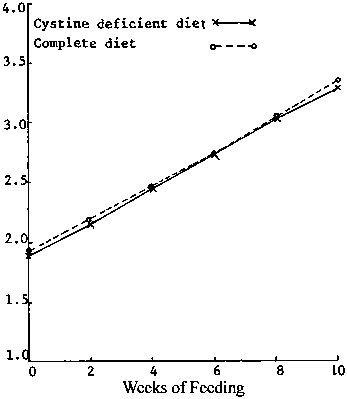 Quantitative requirements by salmonids for the ten indispensable amino acids were determined by feeding linear increments of one amino acid at a time in a test diet containing an amino acid profile identical with whole egg protein except for the amino acid tested. Replicate groups of fish were fed the diet treatments until gross differences appeared in the growth of test lots. An Almquist plot of growth response indicated the level of amino acids required for maximum growth under those specific test conditions. Diets were designed to contain protein at or slightly below the optimum protein requirement for that species and test condition to assure maximum utilization of the limiting amino acid. A comparison of the requirements for the ten indispensable amino acids between species is shown in Table 2.