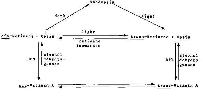 The interrelationships of cis- and trans-vitamin A in the rhodopsin cycle in mammalian vision are shown below: