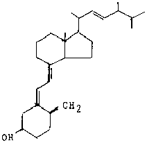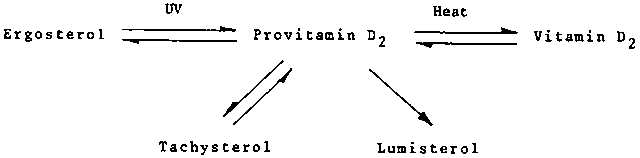 Vitamin D2 or ergocalciferol, is one of several biologically active forms of vitamin D. Vitamin D3 or activated 7-dehydrocholesterol has the chemical formula C27H44O and contains a more simplified, unsaturated 8-carbon side chain. Vitamin D3, also known as cholecalciferol, is formed in most animal tissue by the rupture of one of the ring bonds of 7-dehydrocholesterol by ultraviolet radiation. Cholecalciferol is a white, crystalline compound soluble in fat and organic solvents and is stable to heat and oxidation in mild alkali or acid solution. The conversion of ergosterol to vitamin D2 and several side compounds is shown below.