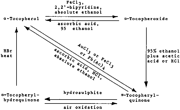 Vitamin E is composed of a class of compounds known as tocopherols. One of the most important tocopherols is a -tocopherol. Eight naturally occurring tocopherol derivatives have been isolated and all belong to the D series. Synthetic a -tocopherol is a racemic DL-a -tocoperhol mixture. The derivatives of tocol or of tocotrienol are named, alpha, beta, gamma, delta, epsilon, eta, zeta1 and zeta2-tocopherol as shown in Table 5. The pure tocopherols are fat-soluble oils which are capable of esterification to form crystalline compounds. The tocopherols are stable to heat and acids in the absence of oxygen, but are rapidly oxidized in the presence of nascent oxygen, peroxides, or other oxidizing agents. The tocopherols are sensitive to ultraviolet light and are excellent antioxidants in the free form. The esters are more stable and are commonly used as dietary supplements-anticipating hydrolysis in the gut and absorption of the free alcohol to act as an active intra- and intercellular antioxidant. Ethyl derivatives on the aromatic ring are also active. Oxidation products of a-tocopherol can be reduced with hydrosulphite to a -tocopherylhydroquinone or, in the presence of ascorbic acid, to a -tocopherol.