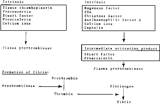 Vitamin K is involved in the hepatic synthesis of blood clotting proteins - prothrombin and proconvertin. A simplified scheme of blood coagulation is shown below: