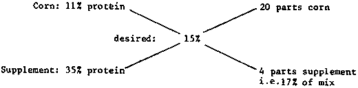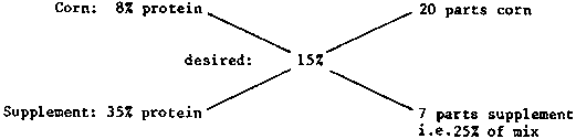 Molasses in excess of 10 percent of the mixture risks the producing of a caked and perhaps mouldy condition in bagged feeds. Less than 10 percent of molasses is enough to appreciably dilute the protein of a mixture, and this dilution must be considered when the mixture is either used as an ingredient or fed as a separate component of the ration, as when diluted and poured on poor roughage.