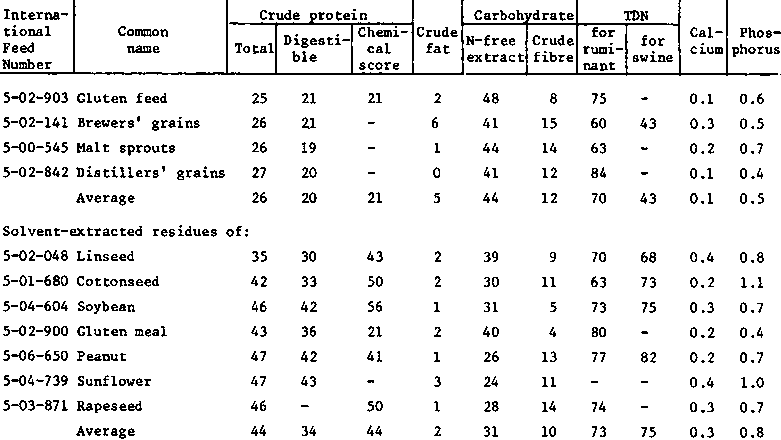 There may be some difference of opinion about whether molasses is an energy feed or should be classed as a special product. Its nutrient contribution to the ration is sugar. (The iron content of molasses is not usually of importance in the ordinary use of this feed.) Its protein is negligible and it contains no fibre or fat. Obviously this product is not freely interchangeable with other feeds of the energy category. Its more important contributions to the ration depend on its physical properties. Because of its sticky nature it tends to reduce the dusty, powdery nature of some finely ground feeds. In this role it often makes a feed mixture more acceptable to livestock. It is doubtful if the sweetness of molasses stimulates feed intake initially, but once accustomed to a sweetened ration animals for the time may not relish unsweetened rations. The effect of molasses in reducing dustiness can be obtained by slight moistening of a powdery feed with water, but this is only effective at the time of feeding, since the feed dries out on standing. Molasses, on the other hand, can be incorporated in the commercially prepared ration, does not adversely affect storage if not used in excess of about 10 percent by weight, and results in the dust-free mixture acceptable to animals. Such mixtures, more often than not, contain products that may be powdery and heavy, and that are present in trace amounts only. The problem of maintaining a homogeneous mixture in such cases is sometimes simplified by the inclusion of 5 to 10 percent molasses. If the feed is to be pelleted, the molasses or dextrin helps to form a durable pellet.