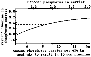 The next problem is that of the fluorine. The Canadian Feeding Stuffs Act gives permitted tolerances in ready-to-feed meal rations for cattle of 0.009 percent, or 90 ppm of dry matter. This is equivalent to 40 g of fluorine in a 1 000 lb batch of feed, or 43 g in 500 kg of feed. If the percentage of fluorine in the phosphorus carrier is known, it is quite simple to calculate how much supplement can be incorporated in 1 000 lb (454 kg) of a meal mixture so that the concentration of fluorine will be 90 ppm as permitted by the Feeding Stuffs Act. Figure 6 shows that if 18 lb (8 kg) of a phosphorus carrier are to be used, then it cannot contain more than 0.5 percent fluorine. If one had a phosphorus carrier with 0.8 percent fluorine, then only 11.5 lb of it could be used per 1 000 lb (or 5.7 kg per 500 kg) of ration.