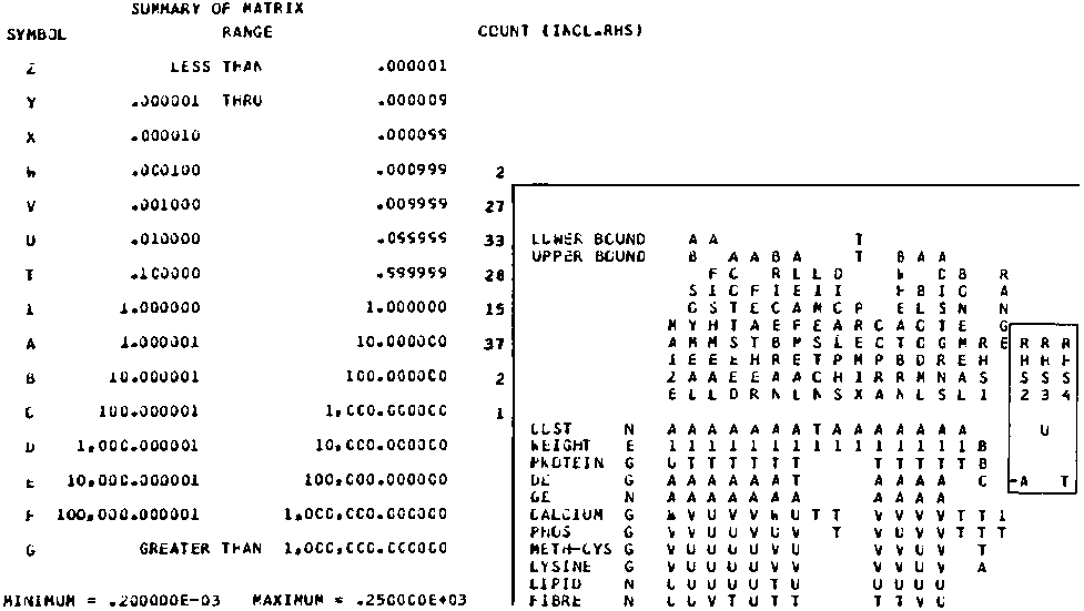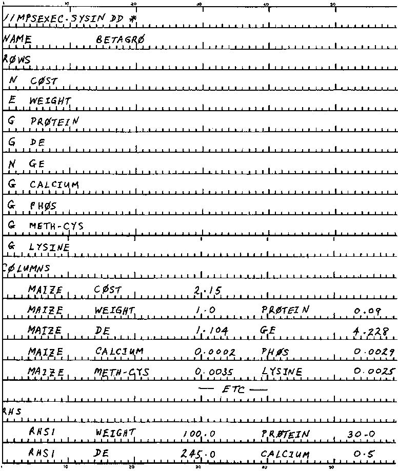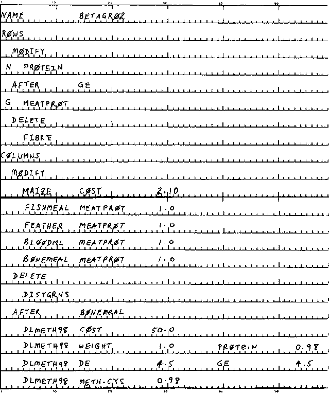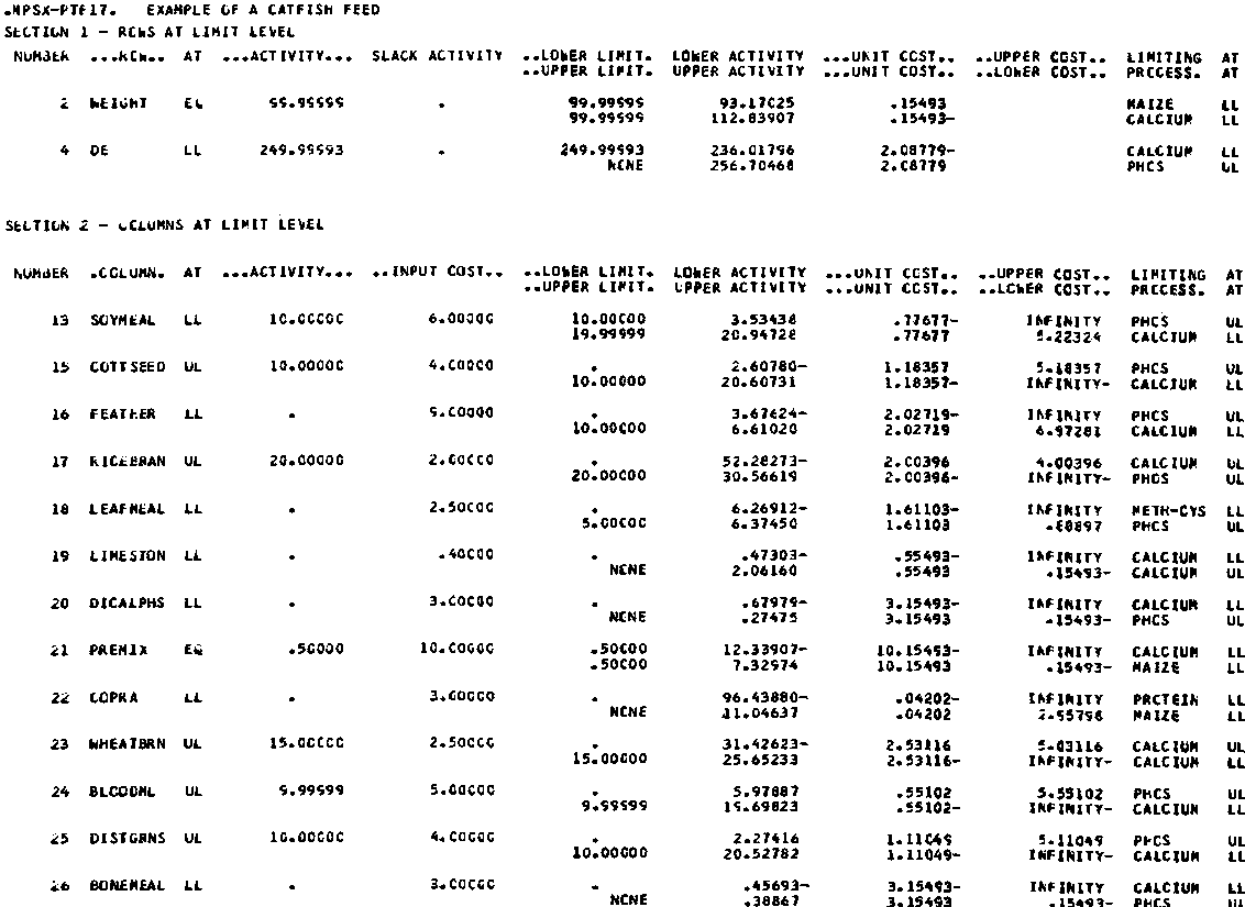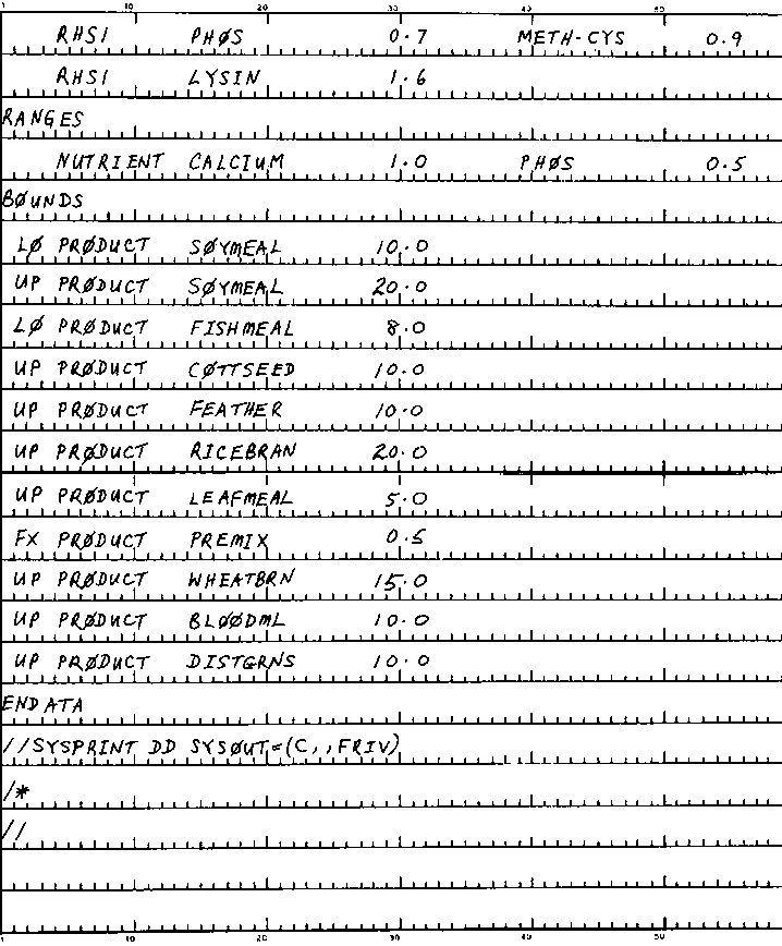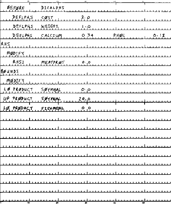 The computer will first solve the least cost solution without using the test ingredient. It will then initiate the PARAØBJ programme. Since it prints out at each iteration using the XFREQ1=1 demand, one will first get a series of non-optimal solutions, so labeled by the computer. These are to be ignored by the user. An optimal solution will then be reached which provides RØW and CØLUMN values of the solution beginning at a zero cost for the test ingredient. It then selects the upper cost level at which a new solution will be needed and inserts this new cost for the test ingredient, resulting in a new solution. This continues until the maximum value for the test ingredient, specified in XPARMAX, is reached. The user can examine the iteration log, printed with each new output, and gain some information as to why specific changes were made.
