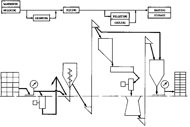 To accomplish the mixing of different ingredients, grinding these ingredients to similar particle sizes, and then putting them together in a single unit, requires a considerable amount of specialized equipment and technical expertise. Some feed plants are designed for specific functions, such as making poultry feeds exclusively; others are designed for producing a variety of feeds. Regardless of the specific purpose of a feed plant, material flow follows a basic pattern (see Figure 1).