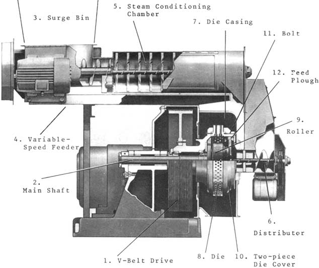 Figure 4a is a cut-out diagram of a large-capacity (200 hp) pellet mill. Although power transmission by means of a V-belt drive is shown (1), gear drive coupling of motor to the main shaft (2) is also possible. Feed from a surge bin (3) is metered into the steam conditioning chamber by a variable speed screw feeder (4). Paddles shown in the steam conditioning chamber (5) agitate the feed to ensure even blending of feed and steam. The conditioned feed is then fed by means of a distributor auger (6) into the pelletizing chamber (7) where it is extruded through the die (8). As the die rotates, feed is pressed against its inner wall by a set of 3 rollers (9). Due to its high rotational speed and heavy load, the die has to be securely harnessed to the shaft. This is achieved by means of a two-piece die cover assembly (10) and 12 strong bolts (11). The rollers usually have a hardened shell with indentations on the surface to provide traction and to reduce slippage of feed. Feed within the pelletizing chamber is continuously redistributed by adjustable feed ploughs (12). Extruded pellets of appropriate lengths are cut off by an assembly of knives (not shown) mounted on the inside of the die casing.