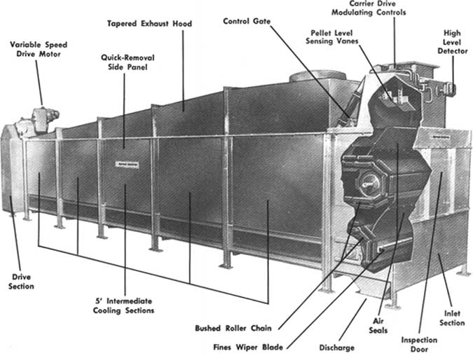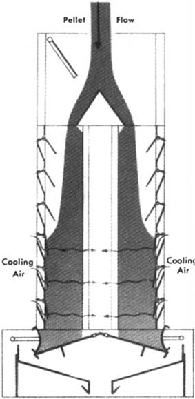 Pellets gradually fill the cooler section of this system until they reach a diaphragm located near the top of the enclosed hopper. Pressure on this activates the discharge gates and the pellets are discharged until the level is below the diaphragm. A bucket elevator or drag screw conveys cooled pellets to either a storage or bagging bin or to a truck for bulk delivery. This type of cooler is preferred when space is limited and is generally more economical than the horizontal type.