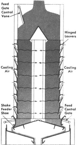A vertical cooler-dryer is shown in Figure 5. Pellets are discharged from the mill into the top of a flat-sided hopper and dropped into an attached cooling bin. This is divided in the middle with a plenum connected to the suction side of a blower fan. The weight of pellets filling the cooler pivots perforated louvers on the two sides to allow cool air to permeate the hot pellets, removing moisture, and cooling the pellets before entering the plenum for discharge through the blower. Pellets leave the bin at the bottom via discharge gates at a rate regulated by the amount of hot pellets entering the cooler. This ensures uniform cooling and drying of pellets.