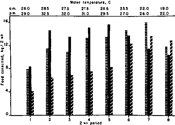 Fig. 3 Food consumed per 2-week period by channel catfish according to three feeding schedules (Horizontal bars, once daily; solid line, twice daily; diagonal bars, alternate days) for 16 weeks in earthen ponds