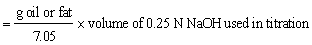 Weigh oil or fat into a stoppered flask and add 50 ml alcohol previously neutralised by adding sufficient 0.25N sodium hydroxide to give a faint pinkish colour with phenolphthalein (2 ml). Titrate with sodium hydroxide and vigorous shaking until a permanent faint pink colour appears.