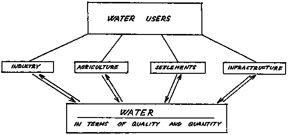 Man, the water user, and the water that is available for the user, form the main components of an ever continuing interactive cycling process, both in terms of water quality and quantity (Figure 1). With his uses, man alters the quality and quantity of the water resources and their allocation which, in turn, alters man's activity. Thus, altered availability of water, in terms of quantity and quality, both in time and space, will induce man to alter his activities to get better and more water during periods of former shortage, and also in places where there has not previously been water.