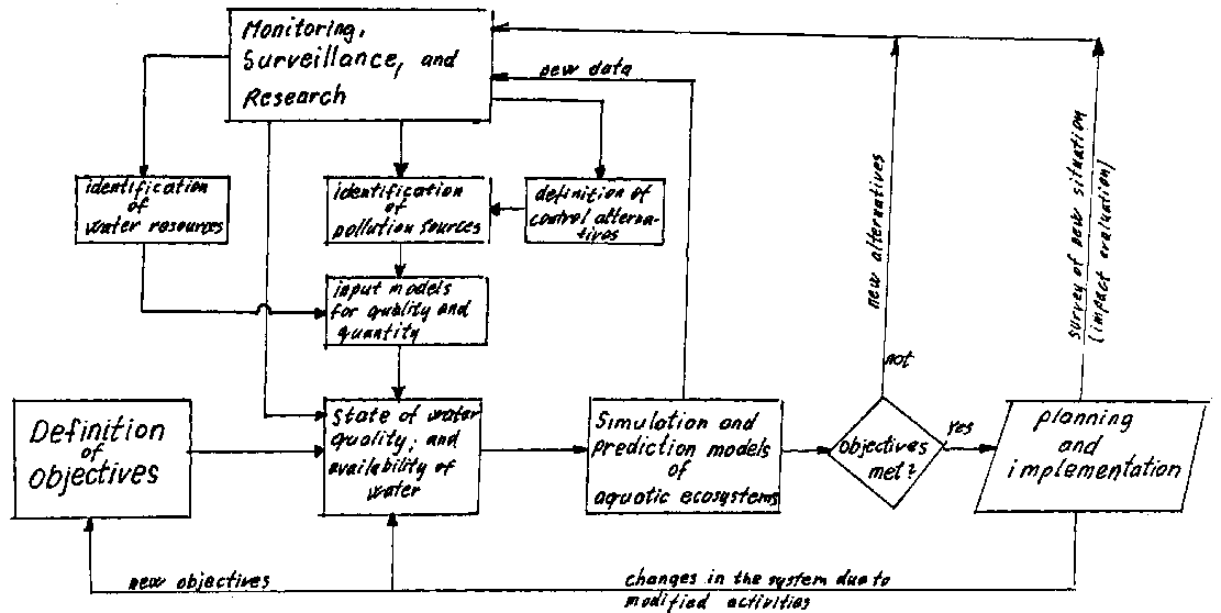 This refers to any water uses and the same principles of management should be followed (Figure 2). Having set the objectives, availability and qualitative composition of the water should be defined, providing a data base. Next comes the planning of water utilization facilities, and one has to predict their effect both in terms of quality and quantity. Following implementation and a continuing monitoring, one has to control the performance of the altered system, and this goes on and on for ever. In the core of all these processes there is, or at least there should be, a basic tool; a system model that provides simulation and prediction capabilities. On the basis of this, one is able to tell with some accuracy what will be the result of his planned activities or his management strategies.