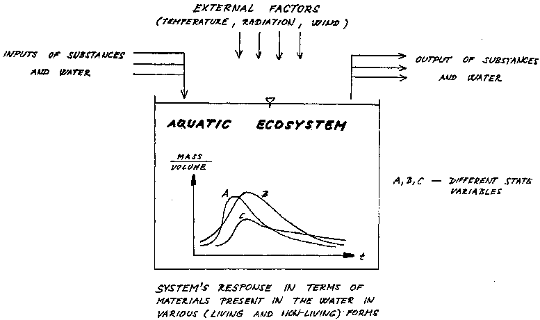The basic theoretical principle behind these models is the same as was discussed before. The main differences in the case of a smaller pond or lake are that dispersion and convective transport of the materials can be neglected, thus assuming the principle of a fully mixed reactor (Chen and Orlob, 1972). Thus, transformations of the substances and their cycling within the components of the ecosystem should be described as a function of time, and a function of other (usually time dependent) factors.