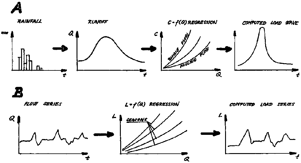 (i) time series analysis, to be followed only when records of reasonable length such as 4 to 5 years are available(ii) a rainfall runoff model can be coupled with regression models developed between flow rate and concentration or flow rate and load values, as indicated in Figure 5.A