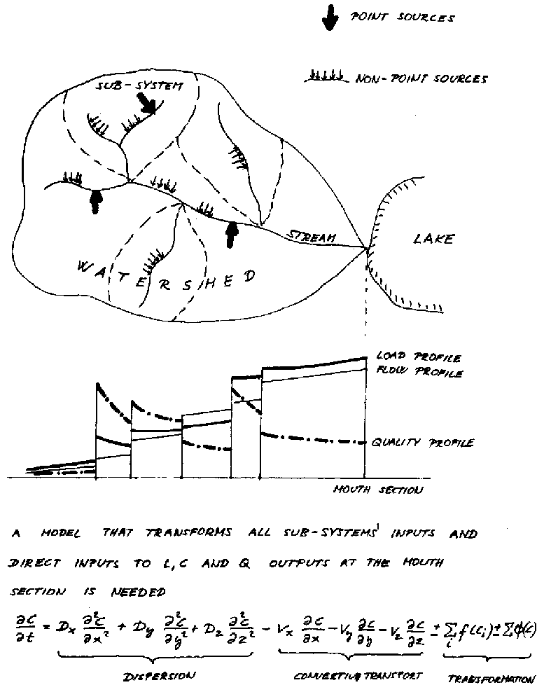There may be an additional problem of input load determination if the main polluting source is somewhere far upstream on the watershed. In this case the removal of pollutants at the source may only result in a lessened decrease of input load at the reservoir or pond intake. In such cases, longitudinal water quality profile studies of the stream in question should be performed, and the data analysed by a water quality model that describes the transport and transformation processes along the stream. This problem is briefly outlined in Figure 6.