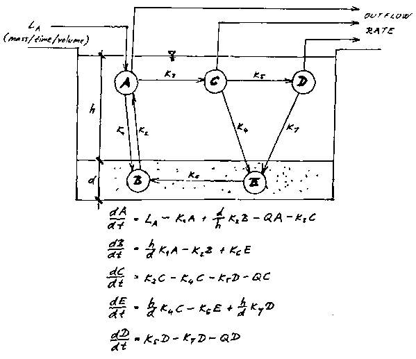 - Components in the water body (A, C and D) will flow out of the system at a rate of Q