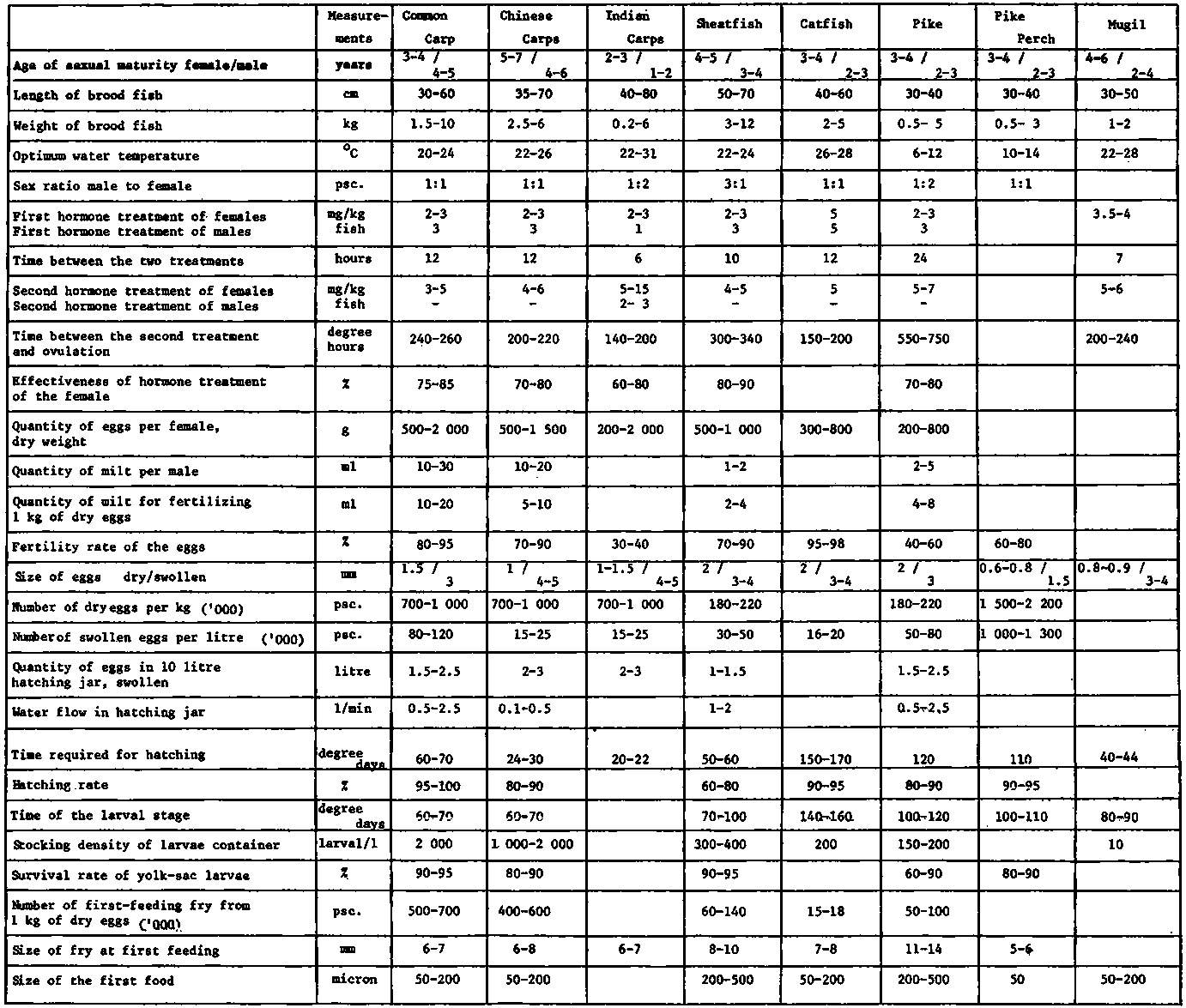 In the case of carp, from hatching to the first reproduction, 10-12 000 degree days of heat is necessary. This quantity of heat under a tropical climate is ensured in l-l.5 years while in Middle Europe in 3.5-4 years.