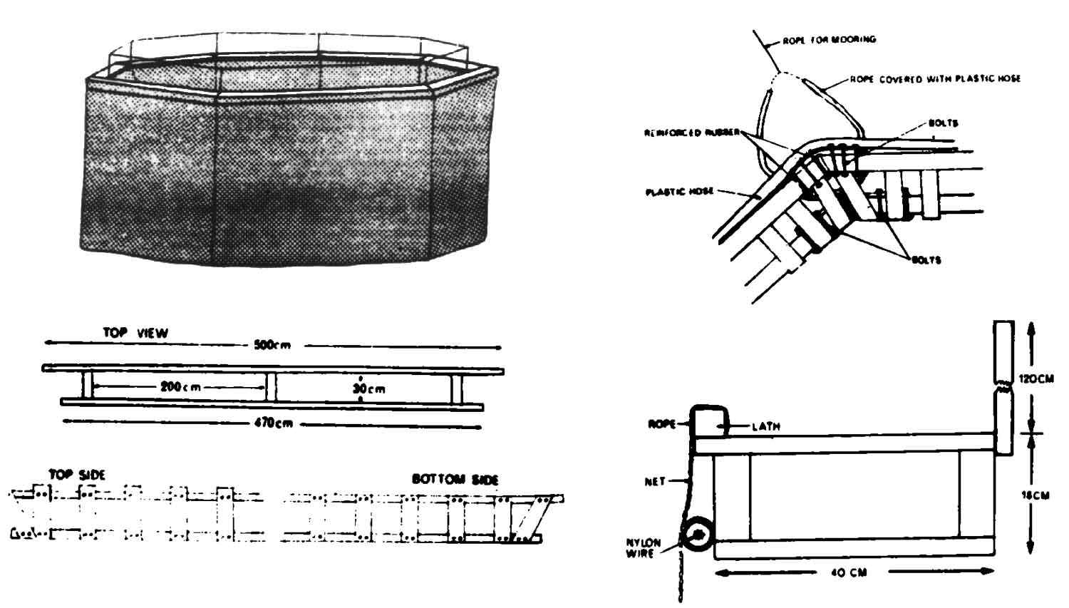 In shallow water the cages can be tied to a pile driven into the bottom. In deep waters the cages can be moored with various configurations of anchors, cables and floats as illustrated in Figure 8.