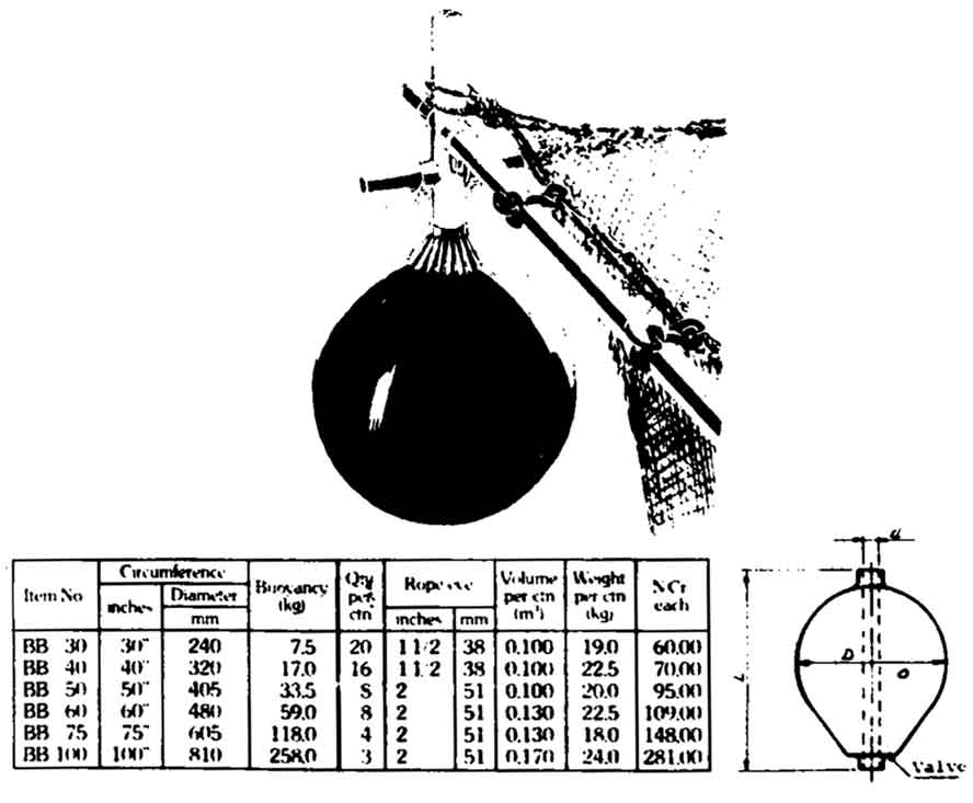 The floats should keep all the floating devices (netting with frame, feeder, walkway, etc.) safely on the water surface. Empty barrels, plastic containers or styrofoam bodies can be used for that purpose, but specially designed air or foam filled plastic floats are also readily available. In Figure 6 an inflatable plastic float can be seen. There are special floats with variable buoyancy so that the position of the cage can be changed in the water body.