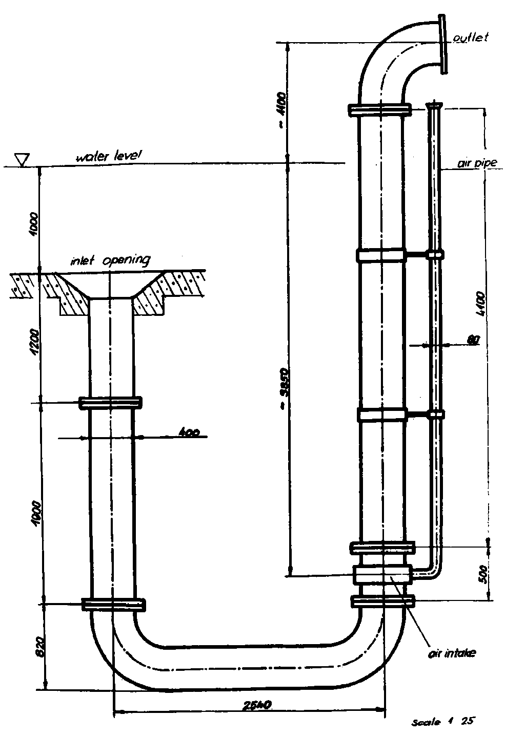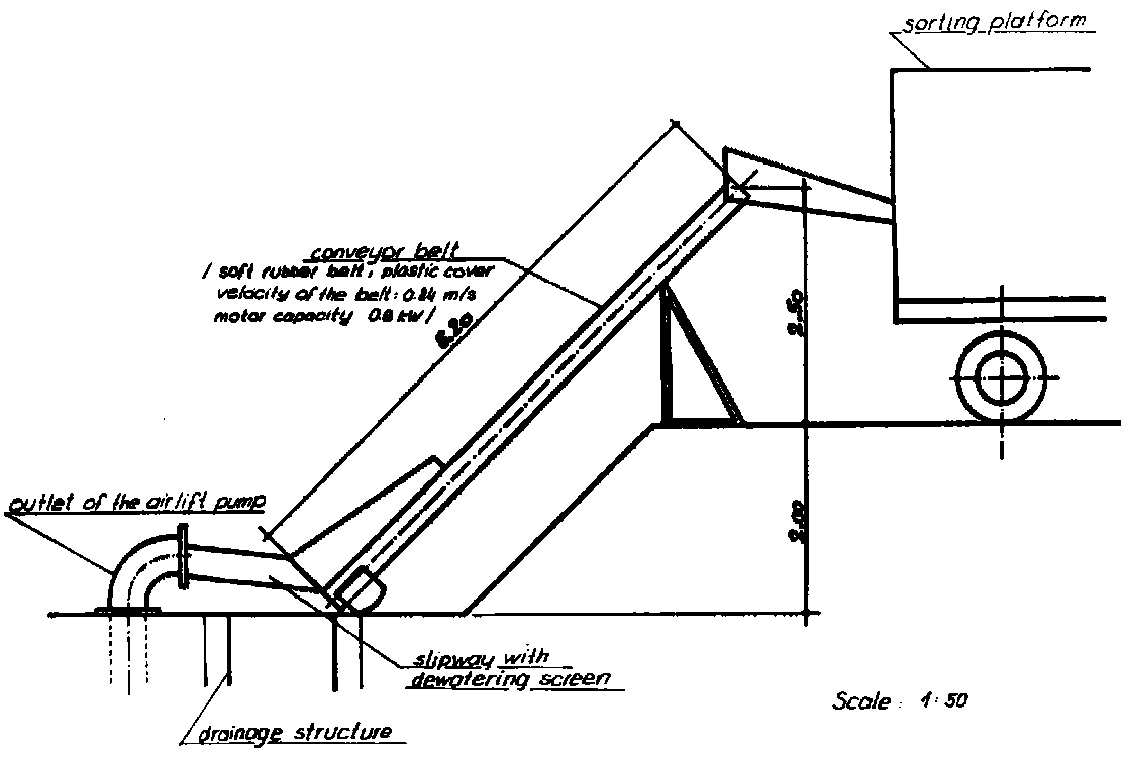 Air lift pumps are used in water management for delivery of water containing solid particles. The principle was adapted successfully for fish lifting, and special air lift pumps have been designed. Even big fish can be lifted without any damage, as there is no moving part inside the delivery pipe, only air bubbles. Figure 10 shows a plan of a mechanized harvesting place with air lift pump. In Figure 11 the water delivery pipe is shown.