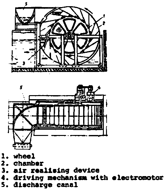 Figure 7. Continuous operation mechanized fish lifts b) Fish lifting device with chambered wheel (USSR)