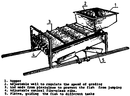 The fish can be sorted into size by different screens. The screen can have several pairs of ribs with an increasing distance from top to bottom (Figure 13). The distance between two ribs is adjustable according to the grading requirement. There are graders where, instead of having fixed ribs, revolving rollers are used, as shown in Figure 14.