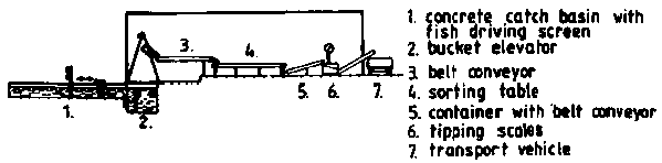 Figure 16. The scheme of complex fish harvesting systems in Hungary c) Central fish harvesting place with indoor sorting (Biharugra State Farm)