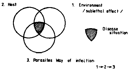 The modern concern for fish diseases was introduced by Snieszko, 1974, who applied the stress theory to fish and water animals. The theory was established by the fact that the effect of water environment was much higher on animals living in water than the air effect on air living animals. Snieszko put the environment-caused stress in fish disease in the foreground of sciences. A triple circle figure (Figure 1) well demonstrates this theory.