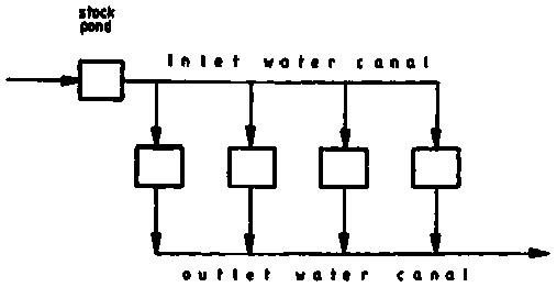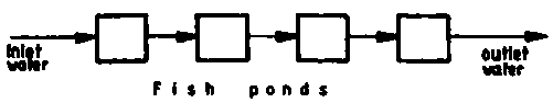 The water quality deteriorates progressively in the four ponds, with the concentration of toxic materials from fish metabolism and the number of parasites always increasing. This system should never be planned. However, in the case of a given situation, we suggest the first pond for breeding small fish, and ponds 2, 3 and 4 for larger fish and adults; older fish are not so sensitive.