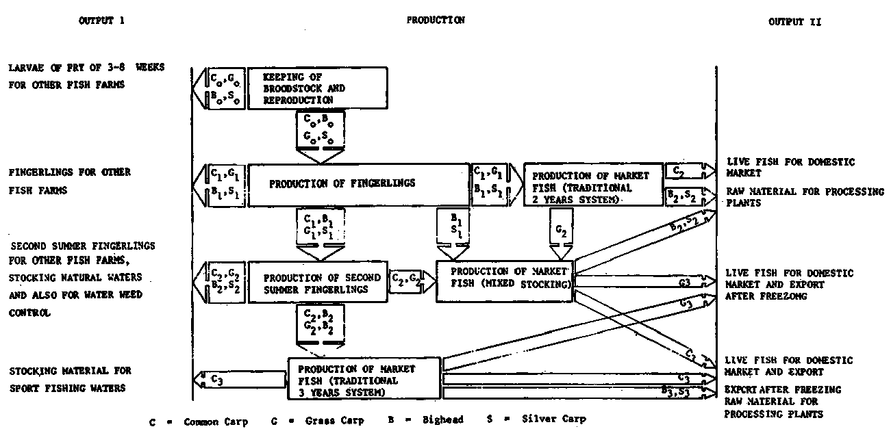 With the widespread introduction of polyculture (common carp + herbivorous fishes) a new pond farm model has been developed as illustrated in Figure 2.
