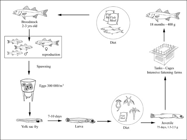Although seabass are farmed in seawater ponds and lagoons, the bulk of production comes from sea cage farming.