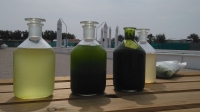 Various concentrations of microalgae, with culture tanks in background