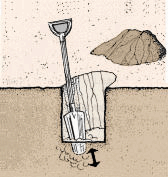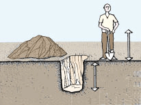Note. En construisant votre étang, vous n'avez pas nécessairement besoin d'enlever une couche perméable peu profonde, si elle recouvre une autre couche non perméable et capable de retenir l'eau. Il vous faut, cependant, descendre jusqu'à la couche imperméable plus profonde pour construire les digues de l'étang, afin d'obtenir un bassin bien fermé et d'éviter les infiltrations horizontales (voir section 90).