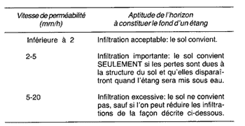 Note. Un horizon présentant une perméabilité satisfaisante pour constituer le fond d'un étang doit avoir une épaisseur minimale de 0,7-1 m, à moins qu'il n'existe des horizons plus profonds ayant une perméabilité et une épaisseur appropriées.