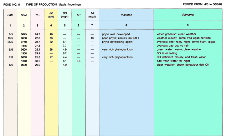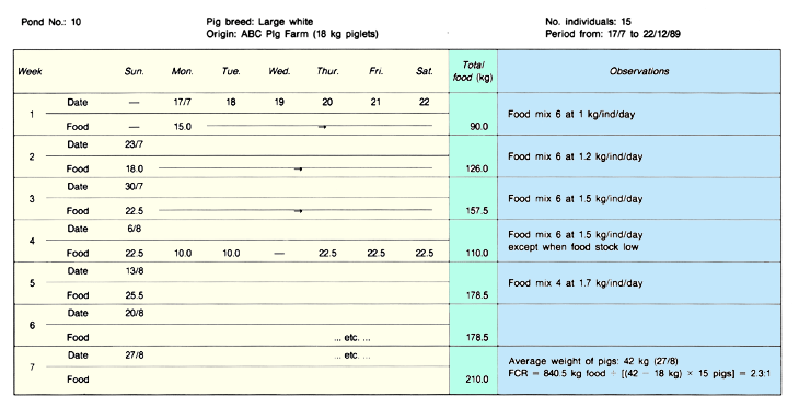 1. Proper management consists of monitoring your fish ponds regularly, keeping good records and planning ahead for the operation of your farm. On this basis, you can for example decide when to fertilize your ponds (see Chapter 6) and how much to feed your fish (see Chapter 10). You can also judge how well supplementary feeds are being utilized and how fast your fish are growing, and you can plan the stocking, transfer and harvesting of your fish. Above all, you can be well informed on how much you spend for or gain from fish farming.
