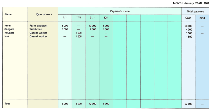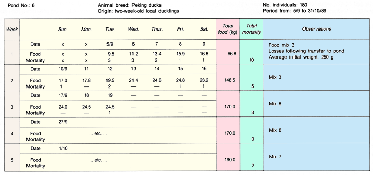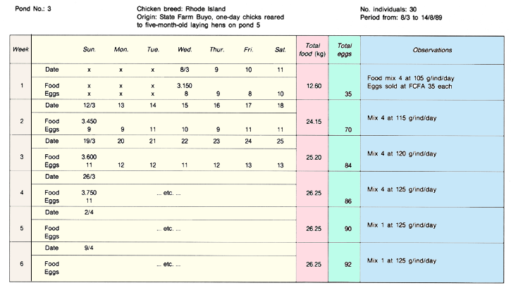 3. A simple form can be used day by day to record for one month all activities around the fish farm, every amount of money spent and all the details of fish production. This is called the daily record form (Form A). You may prepare a form similar to the example below in a small school copybook, using two facing pages per form. Prefer squared paper. You will need 12 forms for one year of records.