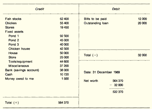 22. In Sections 16.5 and 16.6, you will learn how to keep good records on your fish farm to be able to know, at regular intervals, your total income from fish sales, your related operating costs and, if necessary, your depreciation costs. From these data, commercial farmers will obtain an estimate of gross and net profits. They will then be able to assess in a more precise way their performance as a commercial fish farmer and to improve this performance through management practices (see Section 16.7).