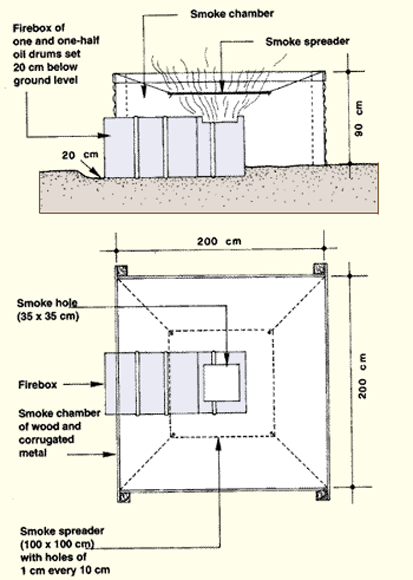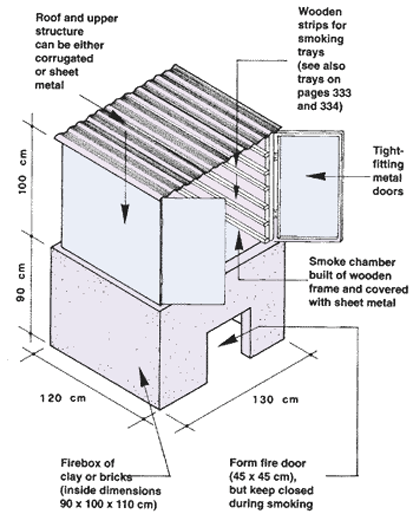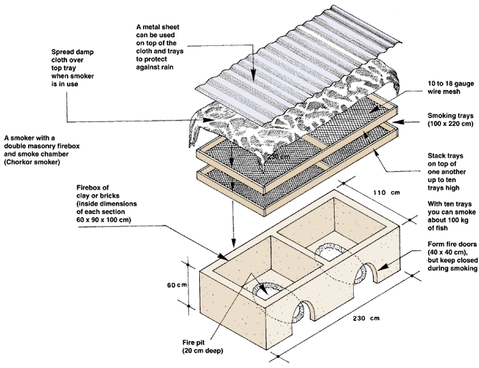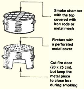 and an oil-drum firebox (Ivory Coast smoker) Note: move the topmost tray to the bottom position from time to time during smoking |