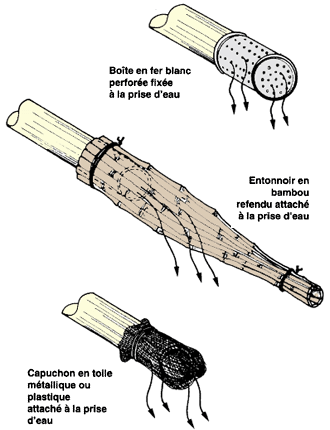 Note: Si votre ferme piscicole a plusieurs étangs, cela vous prendra trop de temps de vous occuper d'une grille à mailles fines placée à la prise d'eau de chaque étang; il vous faudra soit construire un bon système général de filtration en amont de vos étangs (voir section suivante), soit utiliser des récipients filtrants (voir paragraphes 29 à 31).