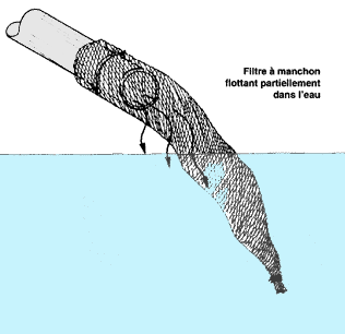 | b) Si cette distance est assez faible, par exemple dans un étang entièrement rempli, le filtre à manchon durera plus longtemps s'il flotte dans l'eau. |