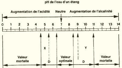 7. La fluctuation du pH varie en intensité. Plus l'étang est productif, plus l'eau sera riche en micro-organismes végétaux (phytoplancton), plus la respiration végétale et animale sera importante, et plus les fluctuations journalières du pH seront intenses. Une valeur de 9,5 du pH sera assez habituelle en fin d'après-midi.