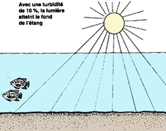 1. Comme on l'a vu précédemment, l'eau d'un étang contient des particules en suspension de différentes sortes. La turbidité de l'eau est causée par la présence de ces particules en suspension en quantités variables: a) La turbidité minérale est causée par une teneur élevée en limon et/ou en argile, ce qui rend l'eau brun clair et lui donne parfois une couleur rougeâtre. Cela peut se produire lorsque l'eau d'alimentation est turbide ou que les poissons qui s'alimentent au fond de l'étang, comme la carpe commune, remuent la vase qui s'y trouve. b) La turbidité due au plancton est causée par une concentration élevée de végétaux et d'animaux minuscules qui donnent à l'eau différentes couleurs de brun, vert, bleu-vert ou jaune-vert, selon l'espèce de plancton dominante. c) La turbidité humique est causée par la présence d'humus (voir manuel 6, Le sol , section 1.6), qui donne à l'eau une couleur brun foncé. Elle provient habituellement de l'eau d'alimentation, bien qu'elle puisse être aussi causée par un excès de matières organiques entrant dans l'étang. |