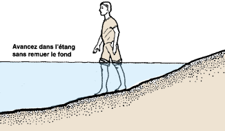 a) Avancez lentement dans la partie peu profonde de votre étang, en essayant de ne pas trop remuer le fond de l'étang. b) Etendez un bras et plongez-le verticalement dans l'eau jusqu'à ce que vous ne puissiez plus voir votre main. c) Notez le niveau de l'eau le long de votre bras:
