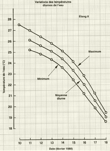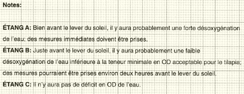 Note: Etant donné que le pH varie dans les étangs d'élevage pendant la journée (voir ci- après), il faudra mesurer le pH à des heures régulières, de préférence au lever du soleil. Il vaut mieux le mesurer à des intervalles réguliers de deux ou trois heures entre le lever et le coucher du soleil, ce qui vous donnera une idée assez précise de la variation du pH pendant la journée.